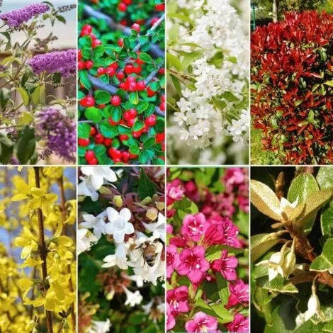Kit pour 20 mètres linéaires en haie simple (ou 15 mètres linéaires en haie double) : Deutzia (2), Forsythia (4), Weigelia (4), Elaegnus ebbingei (2), Photinia ‘Red Robin’ (2), Abelia (2), Cotoneaster (2), Laurier tin (2). La composition peut varier en fonction des disponibilités.